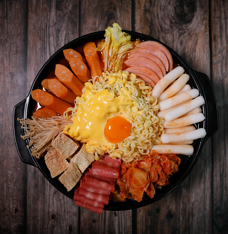 辣白菜、方便面、脆骨腸韓式炒年糕、凍豆腐、午餐肉罐頭、培根肉片、芝士片、辣椒醬、黃豆醬、味淋、味精、牛肉粉調(diào)味料、辣椒粉、白砂糖、清酒、食用鹽